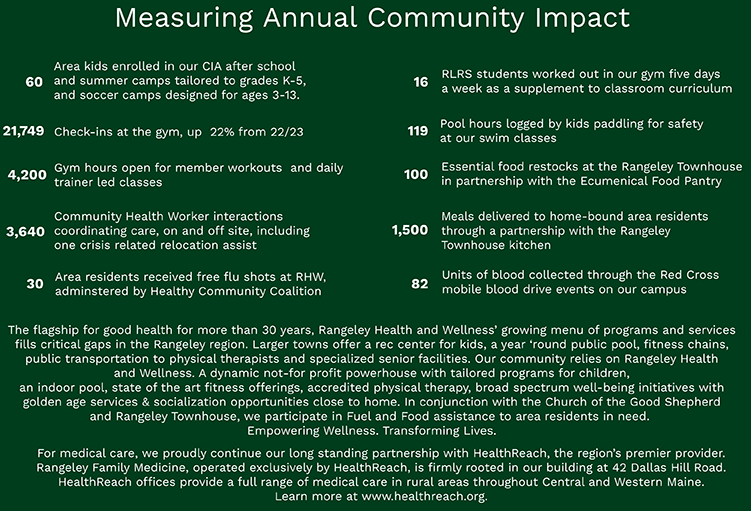 Our mission is to facilitate and promote health and wellness in the Rangeley Lakes region. We are generously supported by individual donors, business gifts, grants, municipal funds, fitness memberships, special events and a host of dedicated volunteers.